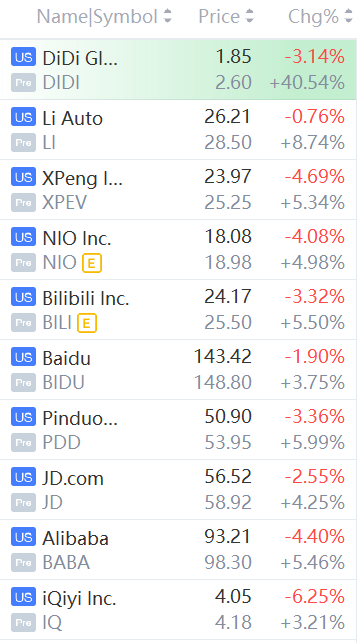 Hot Chinese ADRs jump in premarket trading, DiDi stock surges 40%, Full Truck Alliance stock surged nearly 30%.