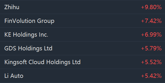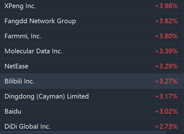 DiDi, NetEase, Li Auto, Baidu, Bilibili, Zhihu and XPeng rose between 2% and 10%.
