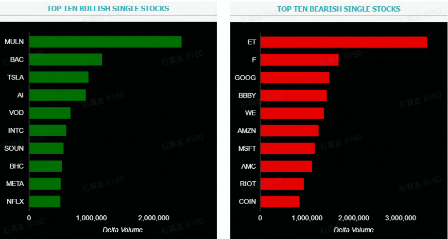 This report shows stocks with the highest volume of bullish and bearish activity by option delta volume, which converts option volume to an equivalent stock volume (bought or sold).