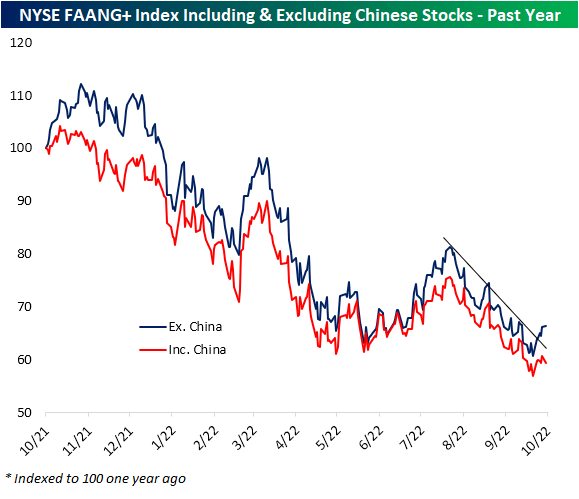 Below we show the NYSE FAANG index as normal and without those Chinese stocks over the past year both indexed to 100 one year ago. The original index (red line) remains firmly in its downtrend over the long term and since the summer. However, when BIDU and BABA are removed (blue line), that summer downtrend has definitively been broken. That is not to say mega-caps have completely reversed the long-term picture, but the FAANG stocks' short-term chart might be more positive than at face value.