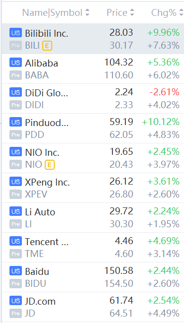 Alibaba, Pinduoduo, JD.com, iQiyi, Baidu, DiDi, Bilibili, Li Auto, NIO, and Xpeng climb between 2% and 8%.