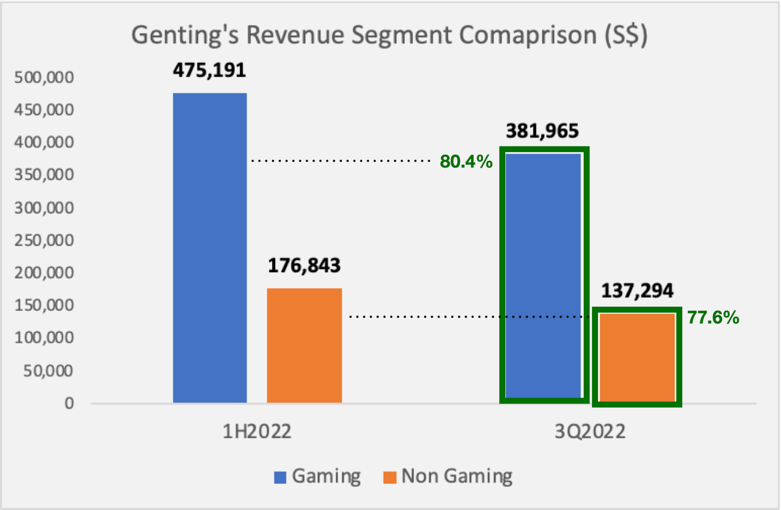 Breaking down Genting Singapore’s segmental revenue contribution, it was notable that 3Q2022’s performance alone for gaming revenue was already 80.4% of 1H2022, and non-gaming revenue was already 77.6% of 1H2022.