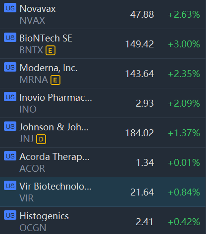 Vaccine stocks climbed in morning trading. Novavax, BioNTech SE, Moderna, Acorda Therapeutics, Inovio Pharmaceuticals and Johnson & Johnson climbed between 1% and 3%.