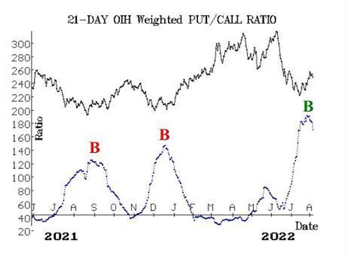 We will hold this position as long as the weightedput-call ratio for OIH remains on a buy signal.