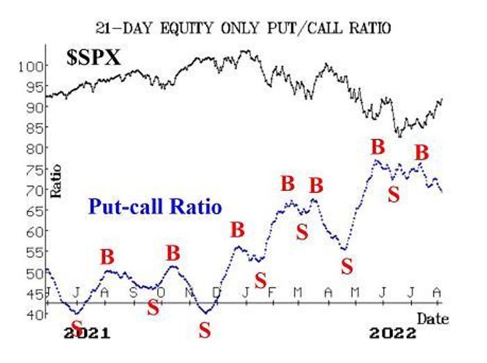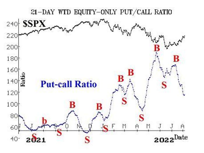 Equity-only put-call ratios continue to fall, and thus both ratios remain bullish in their outlook for stocks. The weighted ratio has been dropping more rapidly and is already in the lower half of its chart. As long as these ratios are declining, that is bullish for the stock market.