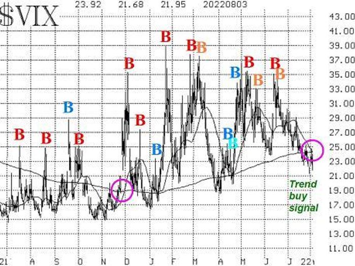 A downward-trending VIX is an intermediate-term buy signal for the stock market. This is the first time since last November that the trend of VIX has been downward.