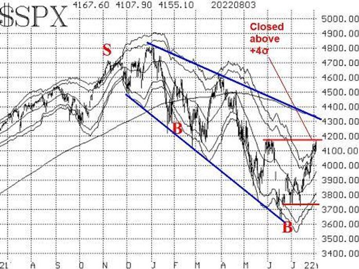 First, the S&P has rallied from that mid-June low right up to the major resistance at 4170. A two-day close above that level would be quite bullish and would set the stage for a challenge of the downtrend line defining this bear market as well as a challenge of the 200-day moving average – both of which are currently near 300.