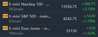 At 07:55 a.m. ET, Dow e-minis were up 528 points, or 1.62%, S&P 500 e-minis were up 74 points, or 1.78%, and Nasdaq 100 e-minis were up 289.75 points, or 2.18%.