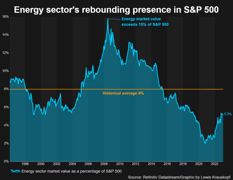 At the same time, many investors beefed up their holdings of energy stocks in 2022 after years of avoiding the sector, which had often underperformed the broader market amid concerns such as poor capital allocation by companies and uncertainties over the future of fossil fuel. The sector’s weight in the S&P 500 roughly doubled last year to 5.2%.