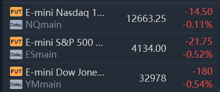 At 08:15 a.m. ET, Dow e-minis were down 180 points, or 0.54%, S&P 500 e-minis were down 21.75 points, or 0.52%, and Nasdaq 100 e-minis were down 14.5 points, or 0.11%.