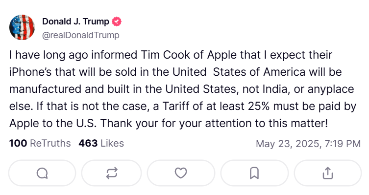"If that is not the case, a Tariff of at least 25% must be paid by Apple to the U.S."