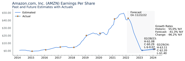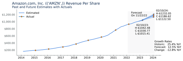 2023 revenue estimates are in line with long term trends. The estimates are centered around $1020.63 per share with the entire range fitting between $1006.82 and $1031.16. The revenue picture for Amazon is stable.