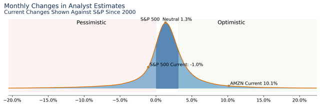We therefore need to look at recent analyst change which I consider analyst sentiment. The below chart summarizes analyst behavior for all stocks in the S&P across the last 2 decades. The neutral point shows analysts tend to increase estimates by 1.3% monthly and are currently pessimistic on the S&P having decreased estimates by -1.0% over the past 30 days. Amazon shows extremely positive sentiment at a 10.1% increase over the past month.