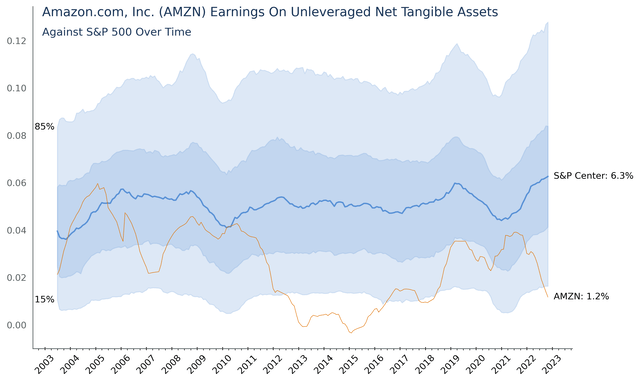Instead of a simple linear scale you should look at Returns on Unleveraged Net Tangible Assets as an either/or, but not neither, measure. Let me explain. In this measure companies should strive to not be mediocre. They should find a strategy of extremes like competing on low cost or high differentiation, but not companies should not try to do both. Great companies have extremely high Returns on Net Tangible Assets and show up above the blue region in the chart above. This group is great because they can grow so fast. Good companies show up below the blue region in the chart. These companies are good when they have a massive capital investment moat around them causing any new entrant to go broke trying to gain scale to compete. Amazon has this moat in the massive logistics system surrounding its retail segments and massive datacenter holdings surrounding its web services.