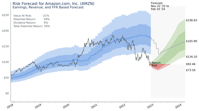 The below chart is a prediction of value at risk and potential return of holding Amazon stock. As shown by the blue intrinsic value region in the chart below, Amazon is below any level of intrinsic value it has traded at in the last 5 years.
