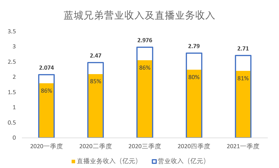 在蓝城兄弟的收入结构中,直播收入是其中绝对的大头,占据80%以上的份额。
