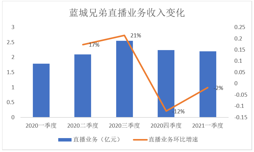 2020年四季度和2021年一季度直播业务收入都呈现下滑态势,其中四季度业务收入环比下降12%。