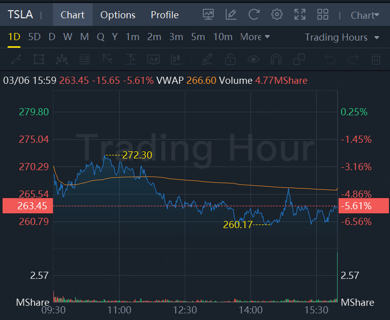 The call and the moves in the overall market weighed on shares. Tesla stock slid 5.6% to $263.45, while the S&P 500 and Dow Jones Industrial Average dropped 1.8% and 1%, respectively.