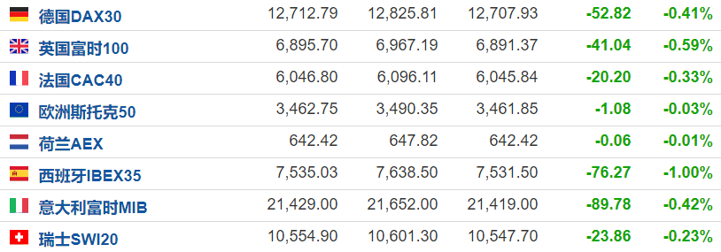 欧洲主要指数全线下跌,德国DAX30跌0.41%,英国富时100跌0.59%,法国CAC40跌0.33%。