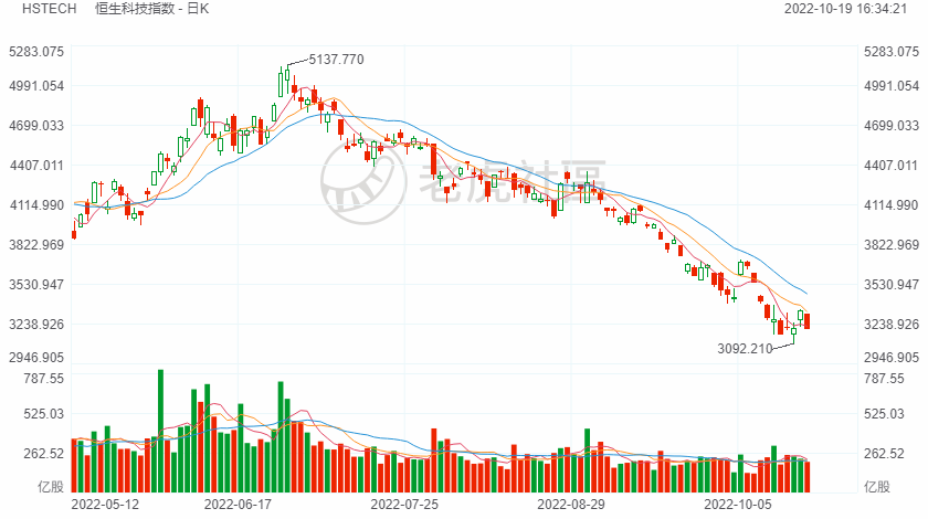 盘面上,大型科技股全线下跌拖累大市下挫,快手-W跌超7%,美团-W跌超6%,京东集团-SW跌5.55%,阿里巴巴-SW跌超5%,腾讯控股、百度集团-SW等均下跌;家电股全天领跌,濠赌股、体育用品、手游股、汽车股、光伏股、餐饮股、中资券商股尾盘跌幅均扩大,新能源汽车股小鹏汽车-W大跌超9%再创新低。另一方面,水务股、在线教育股逆势走高,新东方在线涨超8%表现最佳;电力股、港口航运股、电信股在弱势中表现活跃。今日南下资金净流入54.17亿港元,大市成交额为847亿港元。
