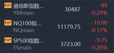 美股三大股指期货持续下挫,截至发稿,道指期货跌0.29%,纳斯达克100指数期货跌0.17%,标普500指数期货跌0.26%。