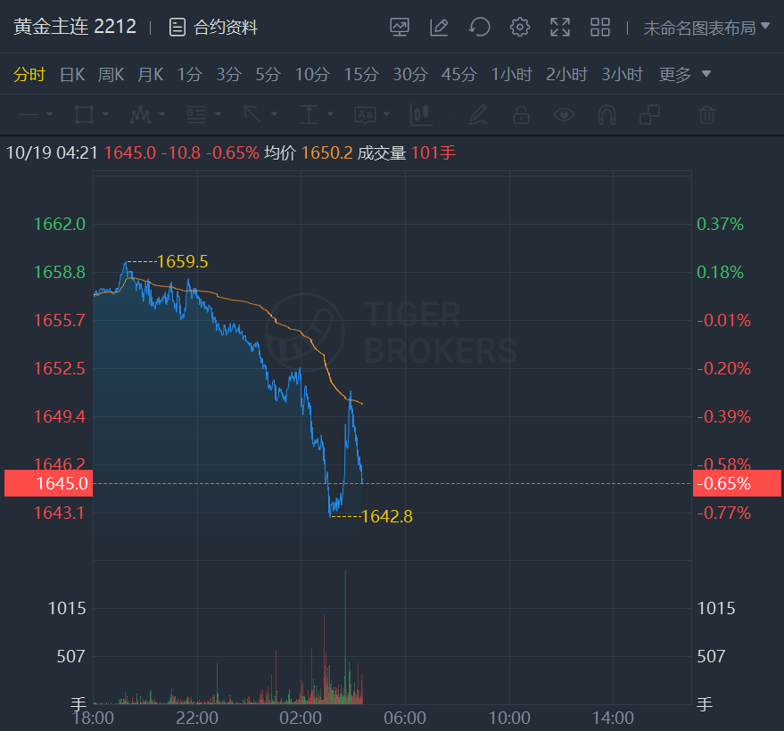 黄金期货震荡走低,现跌0.65%,报1645美元/盎司。