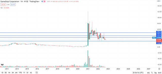 Interest rates have already hit the broader market quite substantially. The federal funds rate has jumped from a target rate of 0% - 0.25% to 3% - 3.25% in an effort to counter 40-year high inflation levels. As a result, the Dow Jones is down roughly 20% from previous market highs. GameStop hasn’t had a great year by any measure; however, the stock is only down roughly 10% from its candle close this January around the $27 price level.
