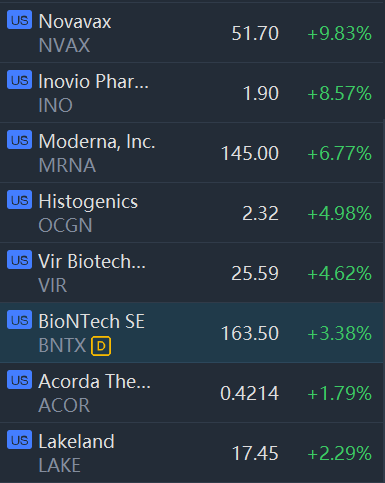 Some vaccine stocks jumped in early trading. Novavax, Inovio Pharma, Moderna, Ocugen, Vir Biotechnology and BioNTech SE climbed between 3% and 10%.