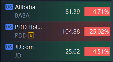PDD Holdings dragged down Chinese e-commerce stocks in morning trading. PDD Holdings plunged 25%, Alibaba and JD.com sank nearly 5%.