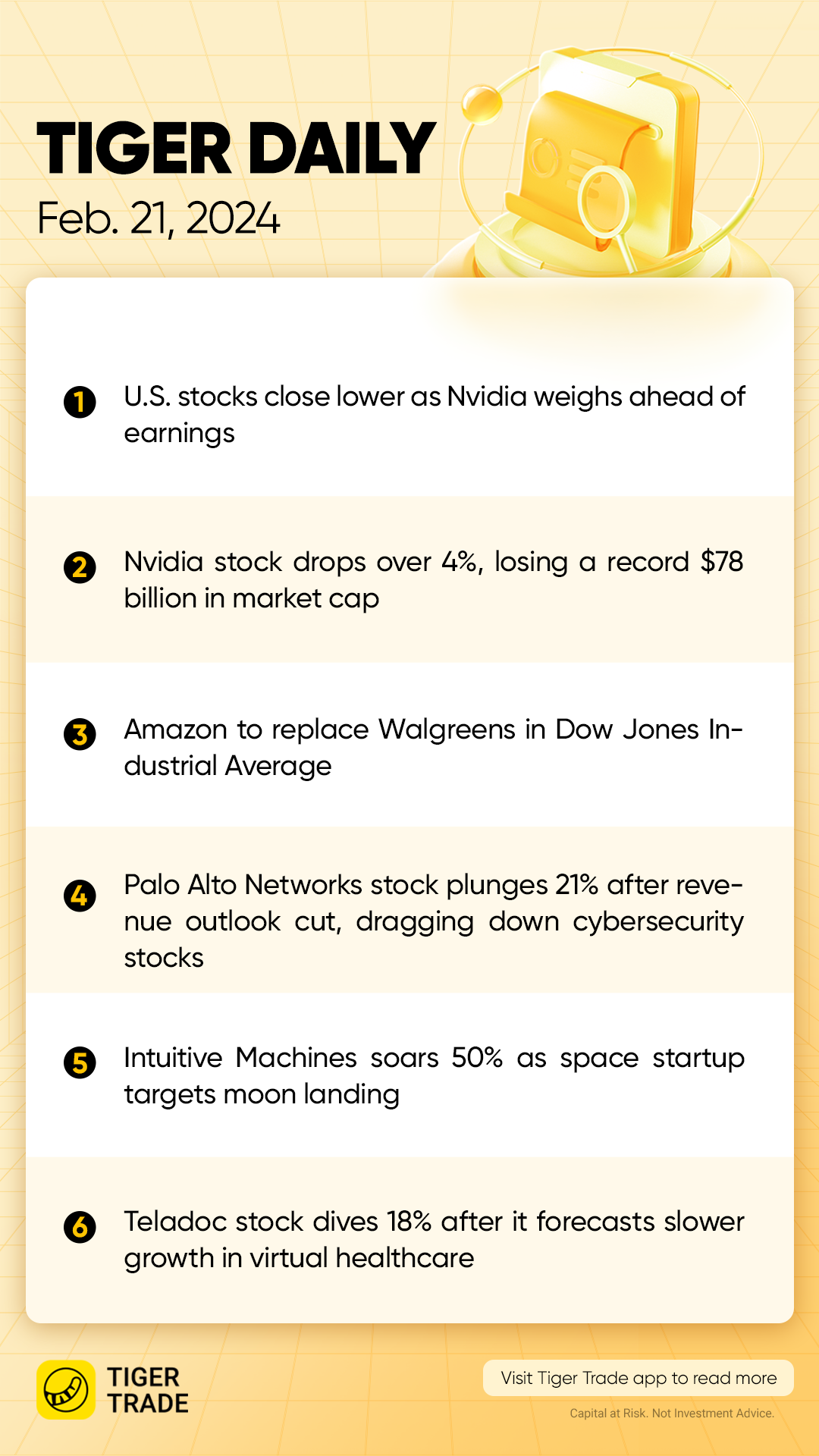 U.S. stocks ended lower on Tuesday, with the Nasdaq showing the largest declines as chipmaker Nvidia stumbled ahead of its highly awaited earnings report, while gains in Walmart kept losses on the Dow Industrials in check.