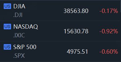 The S&P 500 lost 30.06 points, or 0.60%, to end at 4,975.51 points, while the Nasdaq Composite lost 144.87 points, or 0.92%, to 15,630.78. The Dow Jones Industrial Average fell 64.19 points, or 0.17%, to 38,56.80.
