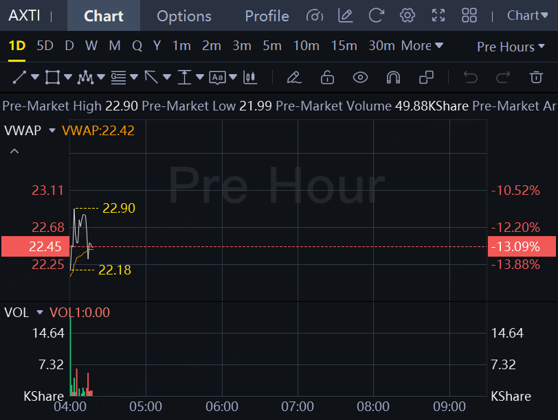 AXT shares dropped after the company cut its revenue outlook, citing China's reduction of export control permits. The stock shed 13% to $22.45 in premarket trading. Through the close, shares were up nearly fivefold over the past three months.