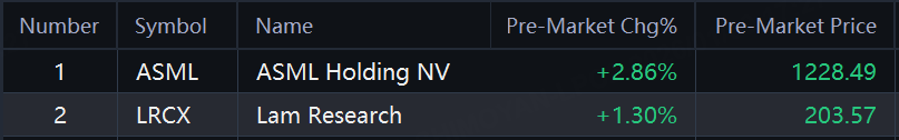 Semiconductor equipment shares jumped in premarket trading with ASML up 3%, Lam Research up 1.3%.