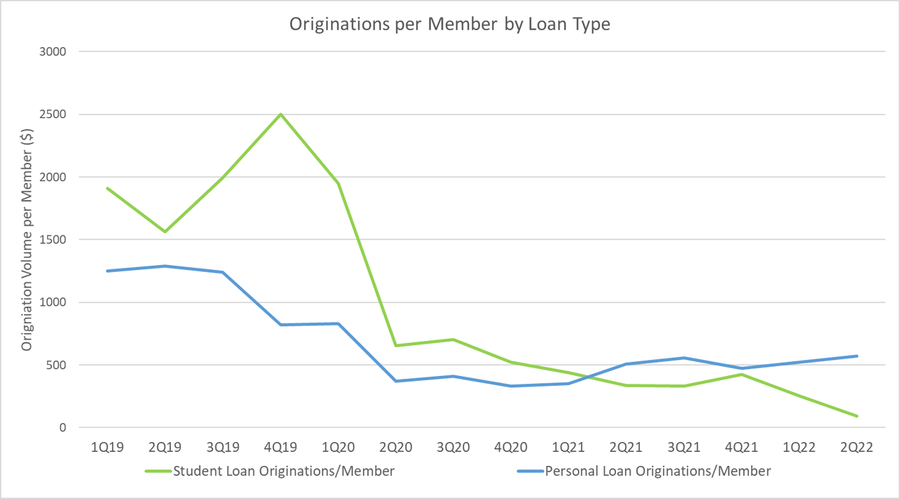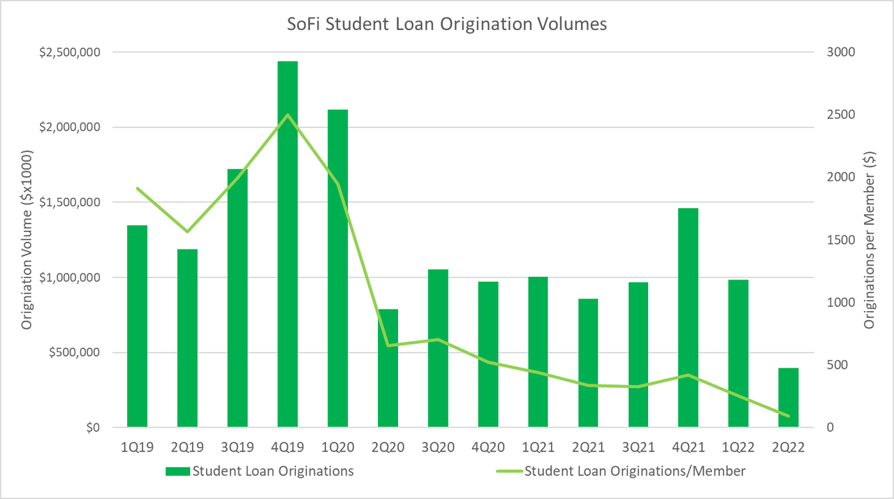 The moratorium does not affect any loans that SoFi already originated, as they are private and the payment and interest pause only affects federal loans. However, it completely removes the impetus for borrowers to refinance their loans. Why would you refinance a loan that you don't have to pay and you may get some or all of that loan forgiven? Refinancing was always the biggest fraction of SoFi's student loan originations, so when the moratorium was announced, their originations fell off a cliff, going from almost $2.5B in the last full quarter without the moratorium (4Q21) all the way to under $400M in originations in the most recent quarter. Originations are now one-sixth of what they were in 2019 even though SoFi have 4.4x more members (what they call their customers) in that same time period.