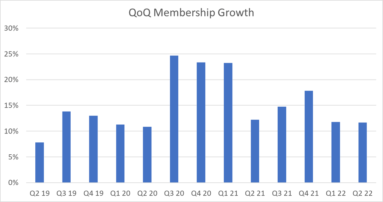 As membership grows, the total number of people they are servicing increases and originations should increase. Here are their quarterly membership growth rates: