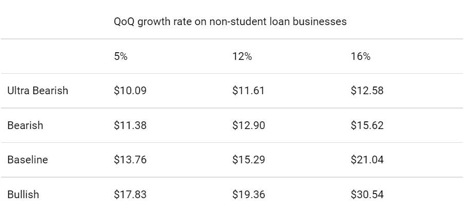 SoFi currently trades at a TTM P/S of around 5. The following table gives the share price at the end of 2023 based on a given growth rate and student loan scenario. This assumes 5% yearly share dilution, and a TTM P/S of 5 at the end of 2023. It is also not outside the realm of possibility that their valuation would increase based on their higher growth rate and early profitability.