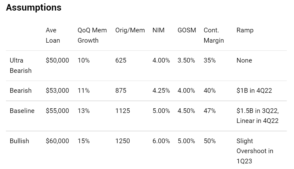 I will go through ultra bearish, bearish, baseline, and bullish scenarios to get a range for the revenue and income that will result from student loans. The key assumptions that go into this model are average loan size, total members, originations per member, net interest margin (NIM), gain on sale margin (GOSM), contribution margin, and ramp rate. I'll cover these individually.