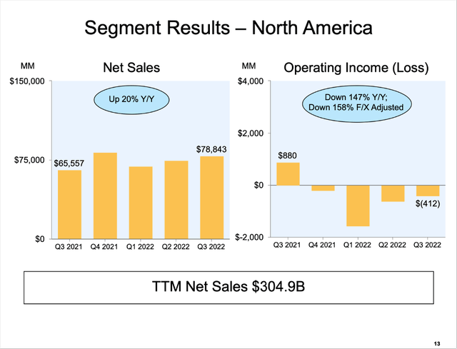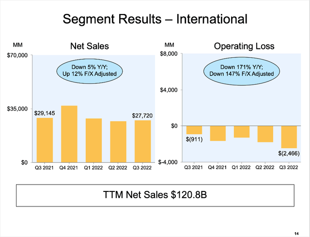 And not only its North America segment was unprofitable this quarter. Its international segment was also unprofitable once again and reported an operating loss of $2,466 million (compared to an operating loss of $911 million in the same quarter last year). Additionally, the segment also had to report declining sales. Compared to $29,145 million in Q3/21, sales in Q3/22 were only $27,720 resulting in 5% year-over-year decline. However, this was in large parts due to currency effects – FX adjusted, sales increased 12% year-over-year.