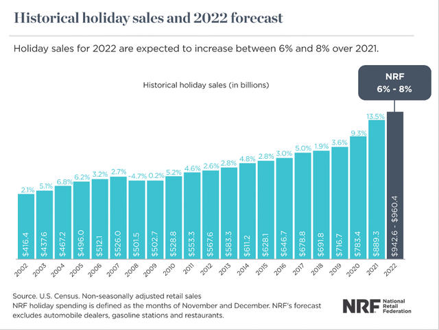 And when looking at the expectations for the holiday sales, analysts and the NRF, the National Retail Federation, are quite optimistic. For the months of November and December 2022,holiday sales are expectedto be between $942.6 million and $960.4 million– resulting in 6% to 8% year-over-year growth, which is quite an optimistic forecast. Compared to the last two years (with growth rates of 9.3% in 2020 and 13.5% in 2021), this seems moderate.