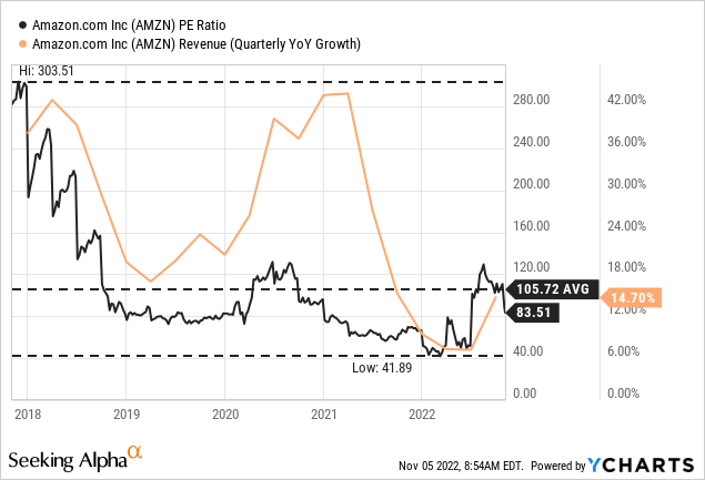 Usually, I offer an intrinsic value by using a discount cash flow calculation. For such a calculation we must make several assumptions and in case of Amazon it is extremely difficult to make these assumptions as the company is lacking consistency. We could assume operating margin to improve again in the coming quarters and Amazon still growing its top line in the mid-to-high teens and we get an extremely undervalued stock. But we could also argue that growth rates will slow down, the recession will hit Amazon hard, and profitability will decline even further in a challenging macroeconomic environment and the stock remains overvalued.