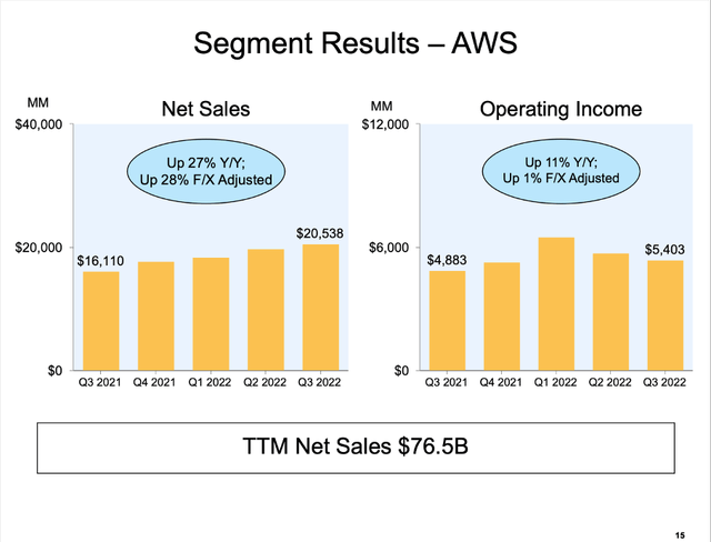 When looking at the different segments, the picture is quite similar as in the last few quarters and years. Amazon Web Services, which was already launched in 2002, continues to be the cash cow for Amazon, and it is the segment which is generating almost all the operating income. In the third quarter of fiscal 2022, AWS generated $20,538 million in net sales. Compared to the same quarter last year, this resulted in 27% year-over-year growth (28% in FX adjusted numbers). Operating income in Q3/22 was $5,403 million, resulting in 11% year-over-year growth.