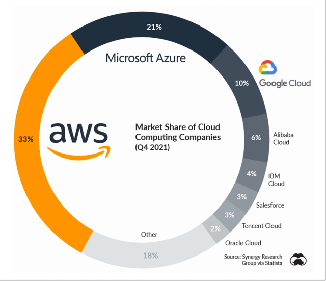And as we can see in the chart below, Amazon is the clear market leader in a fast-growing market. In Q4/21, Amazon AWS had a market share of 33% and was clearly ahead of its two main competitors – Microsoft (MSFT) with Microsoft Azure and Alphabet (GOOG,GOOGL) with Google Cloud.