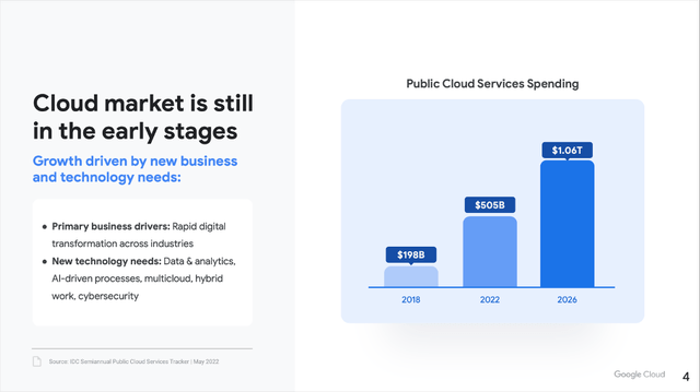 In my previous article about Alphabet, I already mentioned the fast-growing cloud market. Alphabet stated in a recent presentation that the cloud market is still in its early stage. According to this presentation, the public cloud services spendings are expected to double between 2022 and 2026, and not only Alphabet will profit from this trend but Amazon as well.