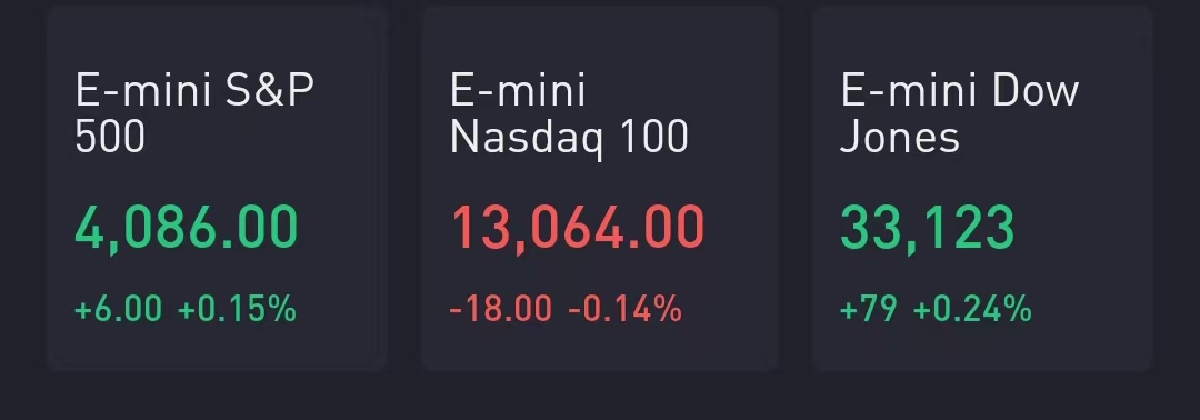 At 8:40 a.m. ET, Dow e-minis were up 79 points, or 0.24%, S&P 500 e-minis were up 6 points, or 0.15%, and Nasdaq 100 e-minis were down 18 points, or 0.14%.