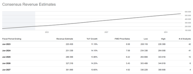 Assuming that Microsoft can sustain its current free cash flow margin of ~33%, and working with estimated revenues of $251.5B in FY 2024, then the software company could be earning up to $83.0B in free cash flow in the next fiscal year. As of right now, Microsoft has a market cap of approximately $1.78T which means the assumptions laid out here result in a price-to-free-cash-flow ratio of 22 X. This multiple may be high for the average company that has no moat and no significant market share… but Microsoft has both and the company is one of the free cash flow-strongest companies in the world. Microsoft is also expected to see healthy top line growth this year and next year: the revenue assumption implies 11% year over growth in FY 2023 and 14% in FY 2024.