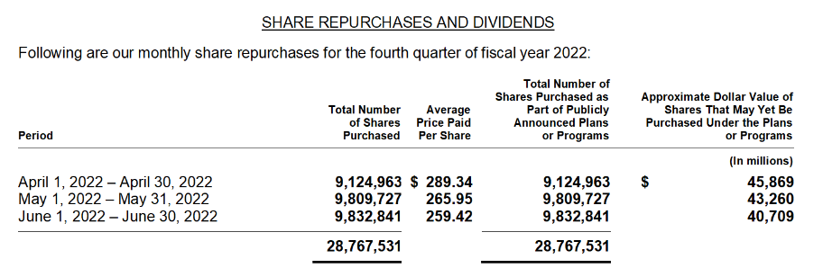Few investors will consider a 1% dividend yield as a key reason to buy Microsoft, but the volume of stock buybacks could be a deciding factor. Microsoft is repurchasing shares aggressively: in FQ4'22, Microsoft repurchased between 9 and 10M shares each month which cost Microsoft a total of $7.8B… which calculates to 44% of Microsoft's free cash flow in FQ4'22.