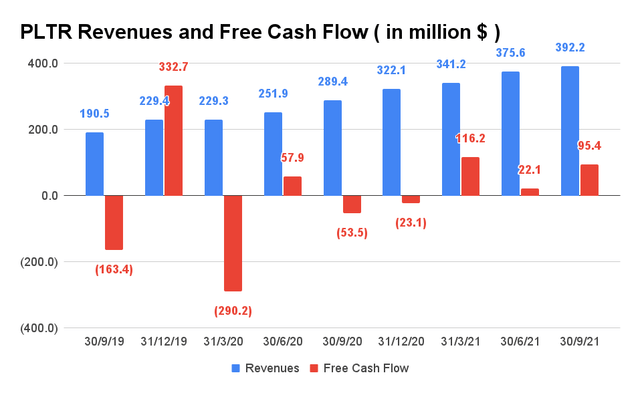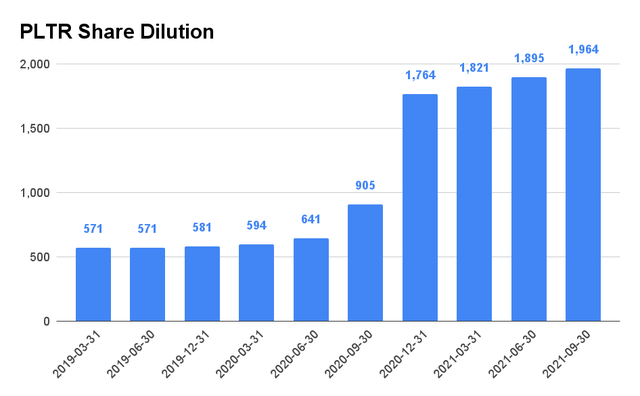 However, it is also important to note that based on the latest 10Q in FQ3'21, "the unrecognized expense related to options outstanding was $940.0 million, which is expected to be recognized over a weighted-average service period of eight years." As a result, we do not expect any significant dilution in the next eight years, given that we are only looking at an average of $117.5M of stock-based compensation annually. In addition, the company has been free cash flow positive in the past three quarters, so PLTR does not need to rely on share dilution for its future operations.