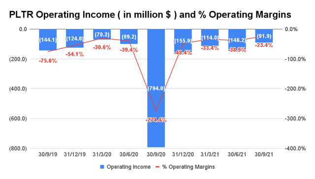 PLTR has been steadily improving its operating margins over the years, from -100.7% in FY2018 to -39.3% in the last twelve months (LTM). The company also reported a further improvement in its operating margins and operating incomes from -75.6% and -$144.1M in FQ3'19 to -23.4% and -$91.9M in FQ3'21, respectively.