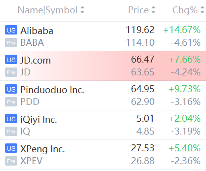 Pinduoduo, JD.com, iQiyi, and Xpeng fell between 2% and 4%.