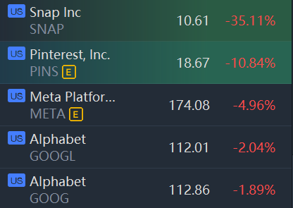 Snap is down 35%. Pinterest fall 11%. Meta Platforms, a fellow ad-focused online power, is down 5%. Meta's "ad duopoly" counterpart Alphabet is down not quite as much: (NASDAQ:GOOG)-1.9%; (GOOGL)-2%.